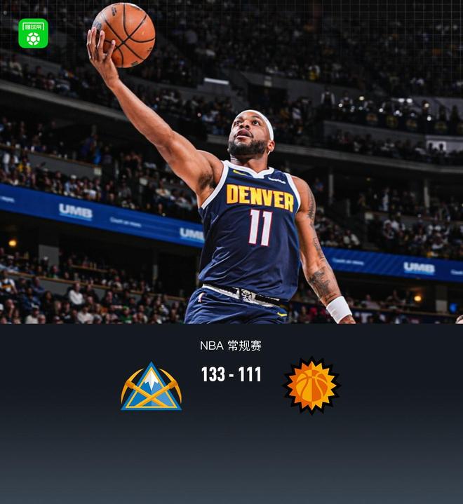 北京时间10月26日,NBA常规赛丹佛掘金队对阵菲尼克斯太阳队。半场掘金71-54领先太阳,半场掘金133-111领先太阳。丹佛掘金队贾马尔穆雷拿下23分6篮板5助攻,布朗20分3篮板3助攻,约基奇14分14篮板15助攻。菲尼克斯太阳队的德文布克得到31分、3个篮板和7次助攻,格雷森·阿伦得到17分、4个篮板和5次助攻。掘金队的贾马尔·穆雷首节拿下9分,太阳队的德文·布克拿下7分。首节结束,掘金34-28领先太阳。第二节,掘金队的阿隆·戈登得到9分,太阳队的狄龙·布鲁克斯得到6分。半场结束,掘金71-54领先太阳。第三节,掘金队的布朗得到9分,太阳队的德文布克得到14分。第三节结束时,掘金队太阳队100-83领先。第四节,掘金队的贾马尔穆雷拿下7分,太阳队的格雷森阿伦拿下6分,掘金队以133-111击败太阳队。全场数据:丹佛掘金队贾马尔穆雷23分6篮板5助攻1抢断,布朗20分3篮板3助攻2抢断,抢断方面阿隆戈登17分2篮板1助攻3抢断。菲尼克斯太阳队方面,德文布克拿下31分3篮板7助攻,格雷森阿伦17分4篮板5助攻1抢断,狄龙布鲁克斯15分3篮板2助攻4抢断1盖帽。丹佛掘金队首发阵容:贾马尔·穆雷、布朗、阿隆·戈登、卡梅隆·约翰逊、约基奇。菲尼克斯太阳队:德文·布克、格雷森·阿伦、狄龙·布鲁克斯、瑞恩·邓恩、伊戈达洛。