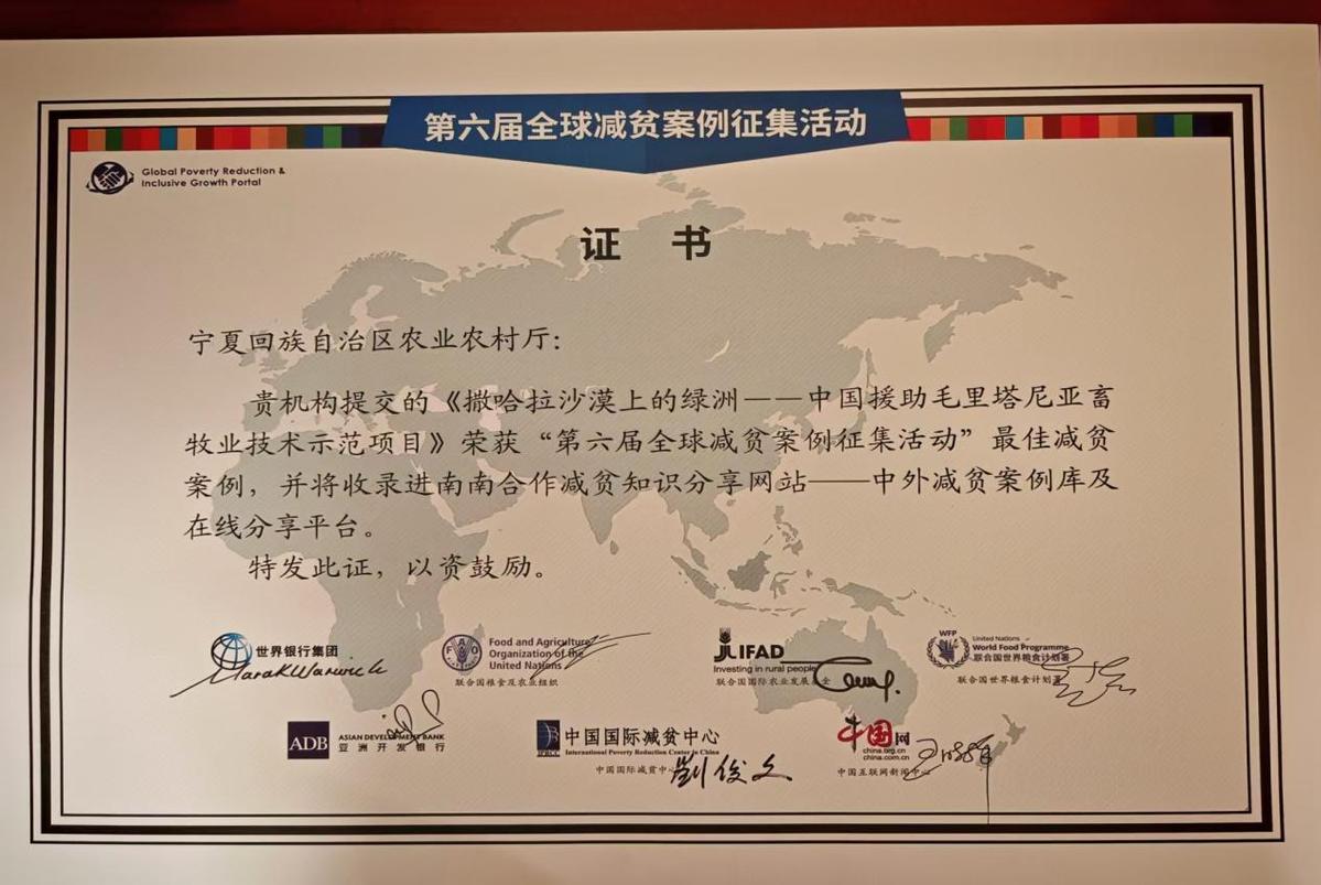 宁夏农业农村厅评选的“撒哈拉沙漠绿洲——中国援助毛里塔尼亚畜牧技术示范项目”荣获“第六届全球减贫案例征集”最佳减贫案例。这是宁夏继2024年“乔媳妇数字村助力弱势群体发展——闽宁和美电商帮扶工坊案例”获奖后,再次荣获这一国际荣誉。